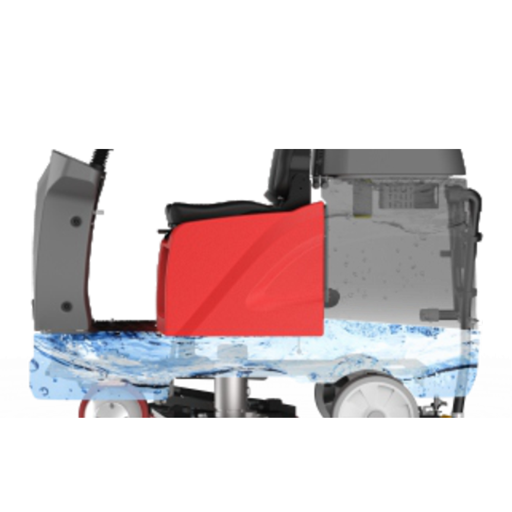 Модель оснащена широким щёточным узлом с рабочей шириной 910 мм, что позволяет эффективно очищать большие площади за минимальное время. Увеличенная водосборная балка обеспечивает качественный сбор грязной воды, оставляя поверхность сухой и безопасной для движения.